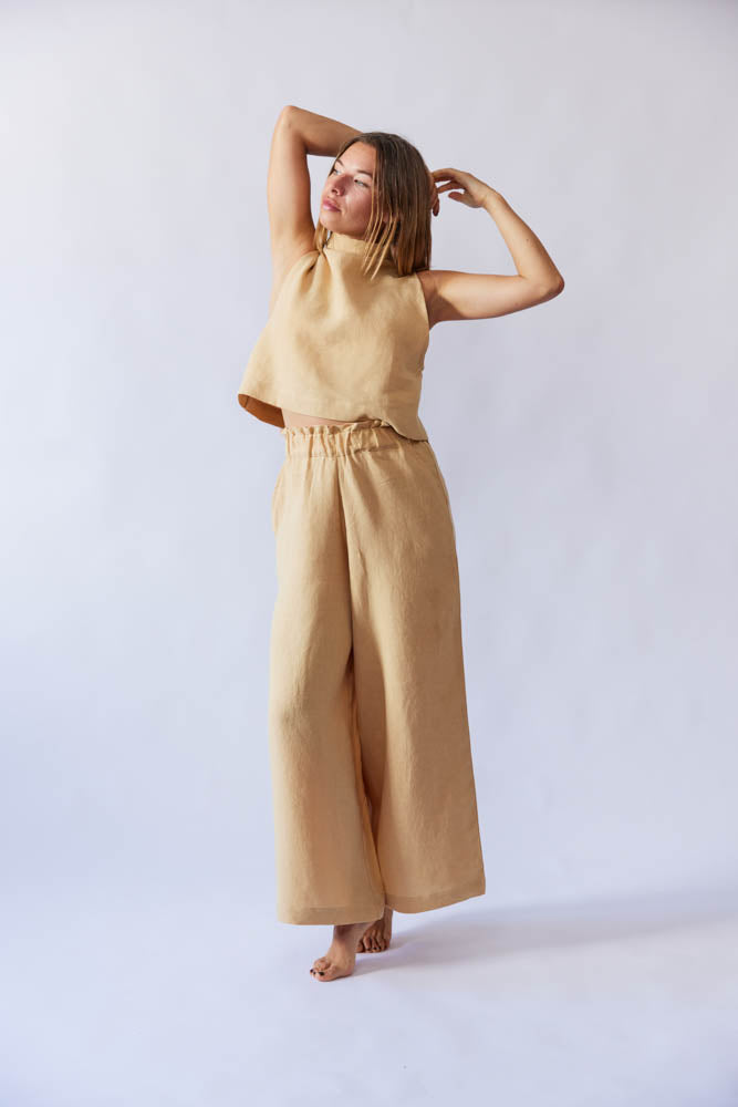 Our new favourite- Mona pant, in a beautiful antique wash linen, made from European flax. In a perfect camel colour, these will be your summer staple pants. With comfy wide sculptural elasticated paperbag style waist and side pockets.