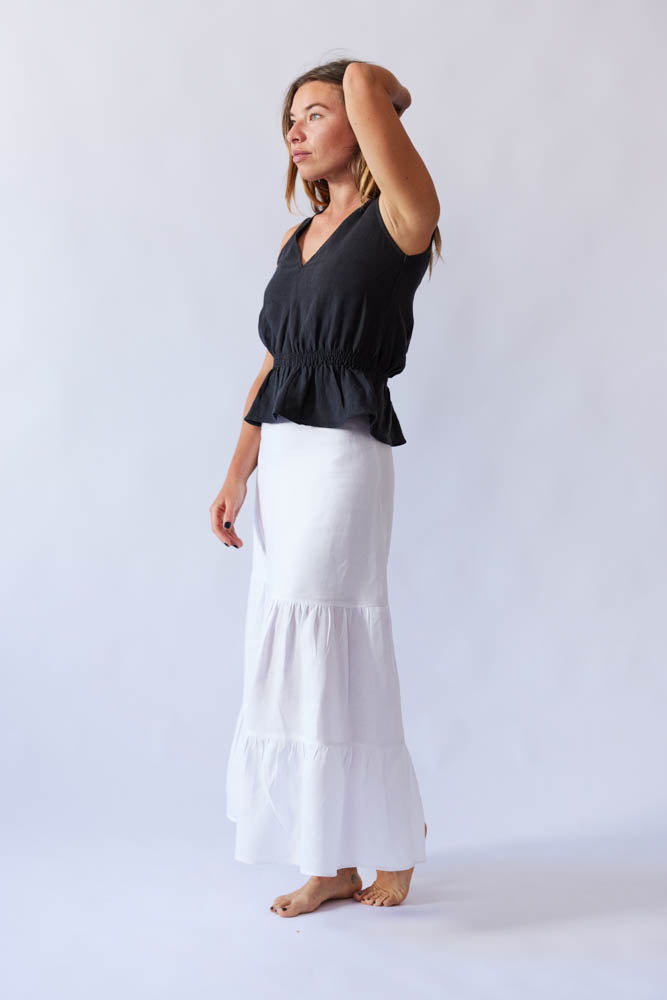 Deep vee top with beautiful shirred waist. In a luxe white linen herringbone weave.